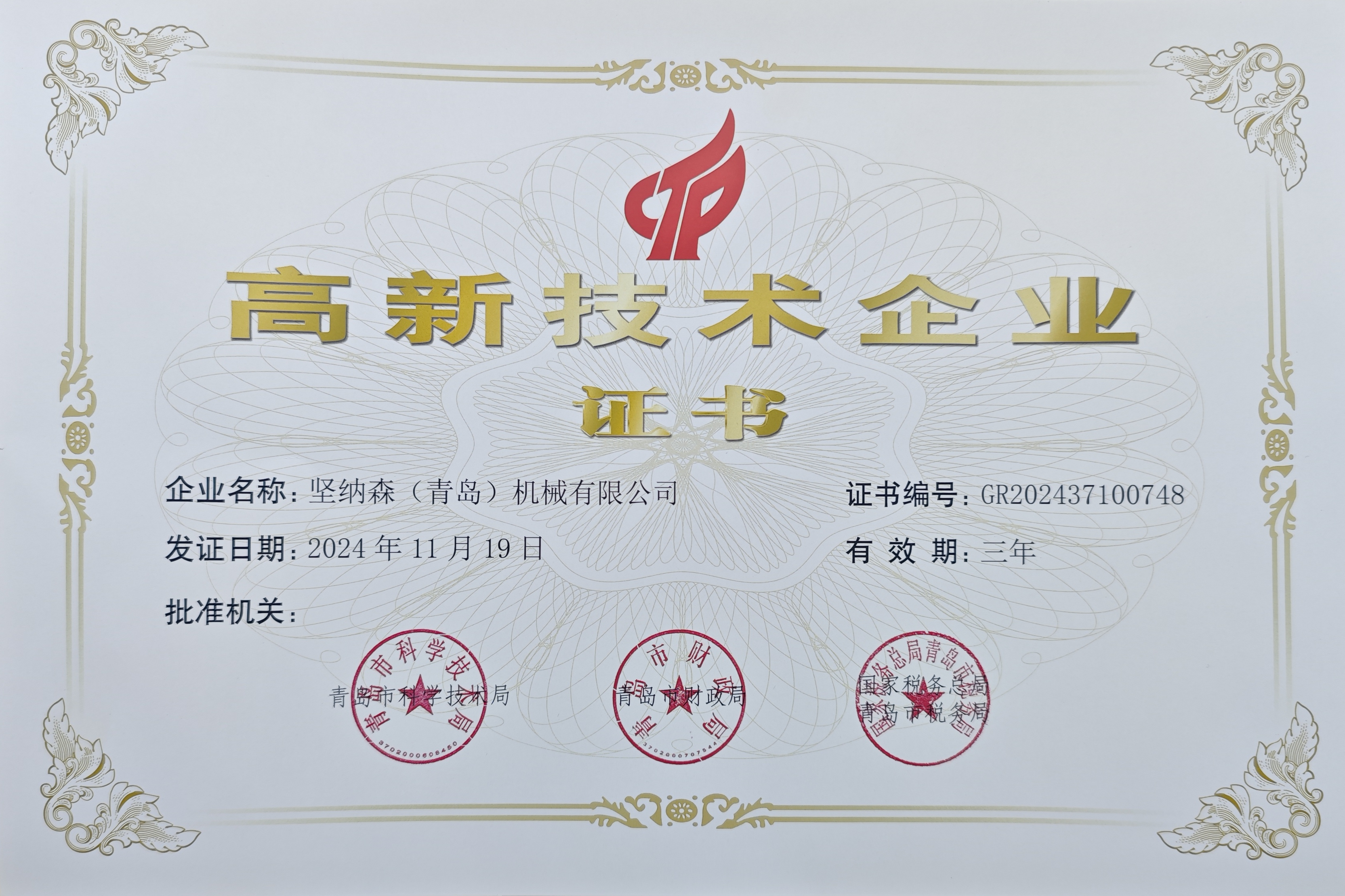 • 熱烈祝賀堅納森(青島)機械有限公司榮獲“高新技術企業”再次認定!
